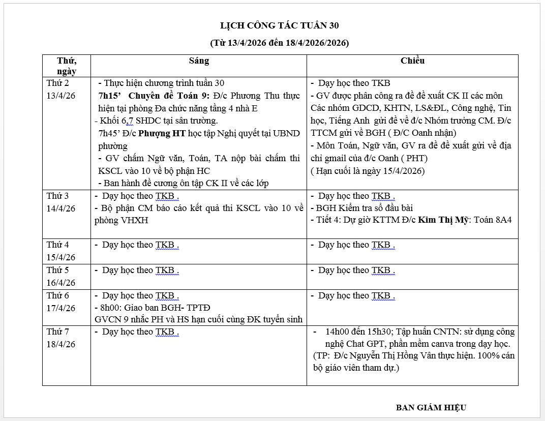 Lịch công tác tuần 30 (từ ngày 13/4/2026 đến ngày 18/4/2026)