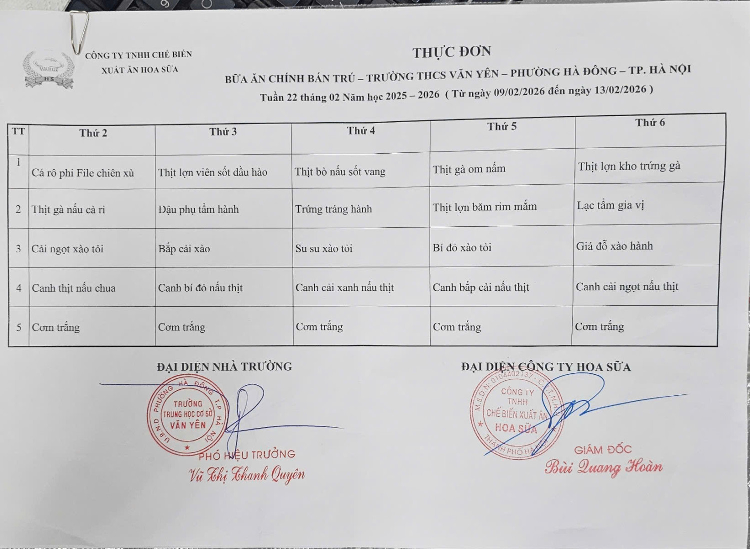 Thực đơn bán trú tuần 22(từ ngày 9/2/2026 đến ngày 13/2/2026 )