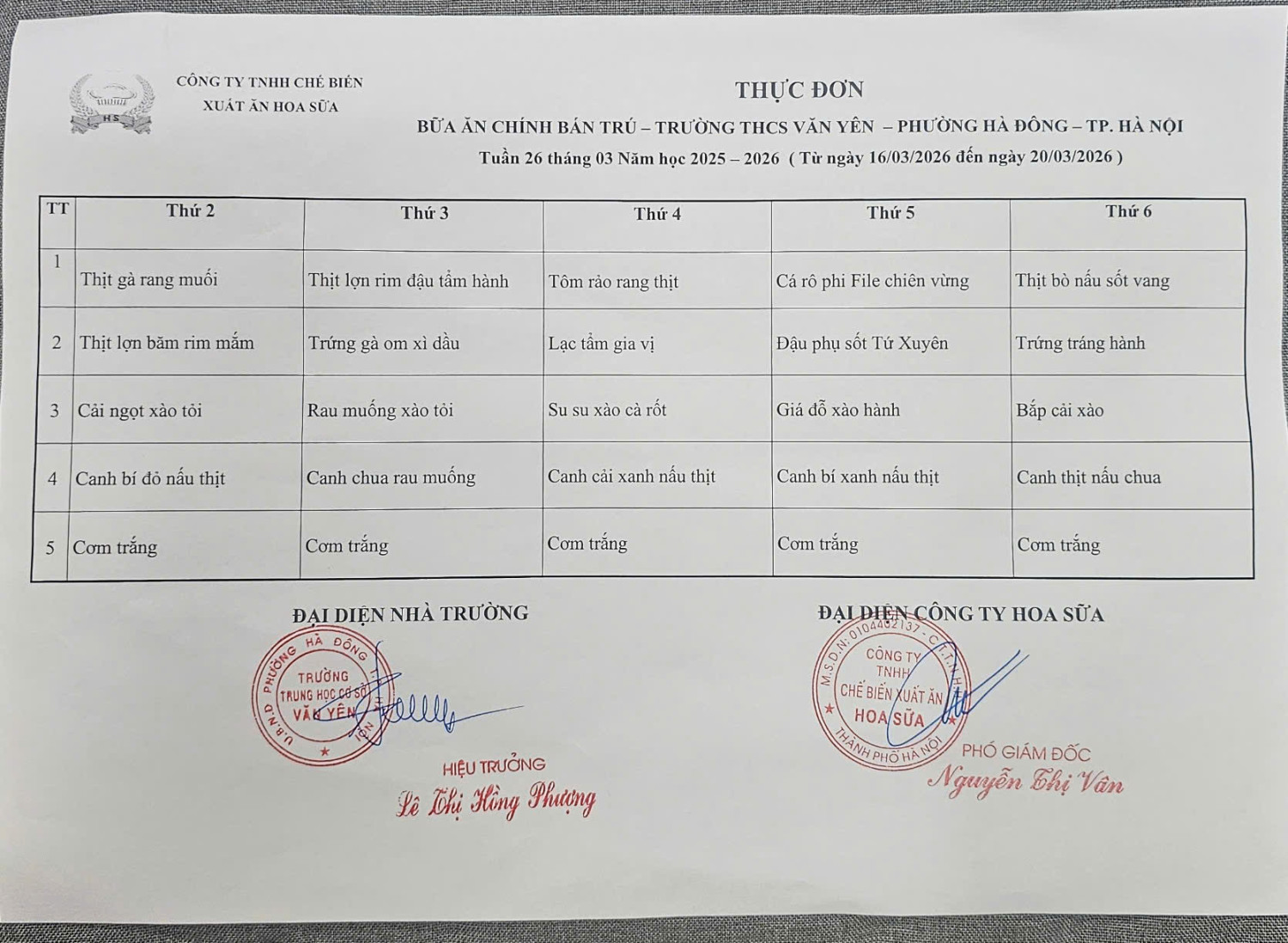 Thực đơn tuần 26(từ ngày 16/3/2026 đến ngày 21/3/2026)