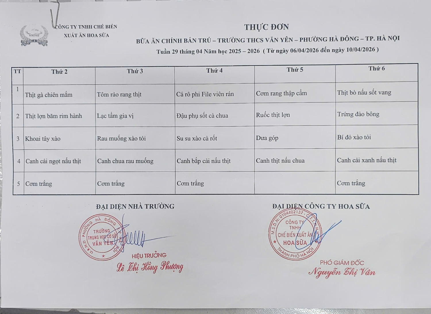 Thực đơn tuần 29 (từ ngày 6/4/2026 đến ngày 11/4/2026)